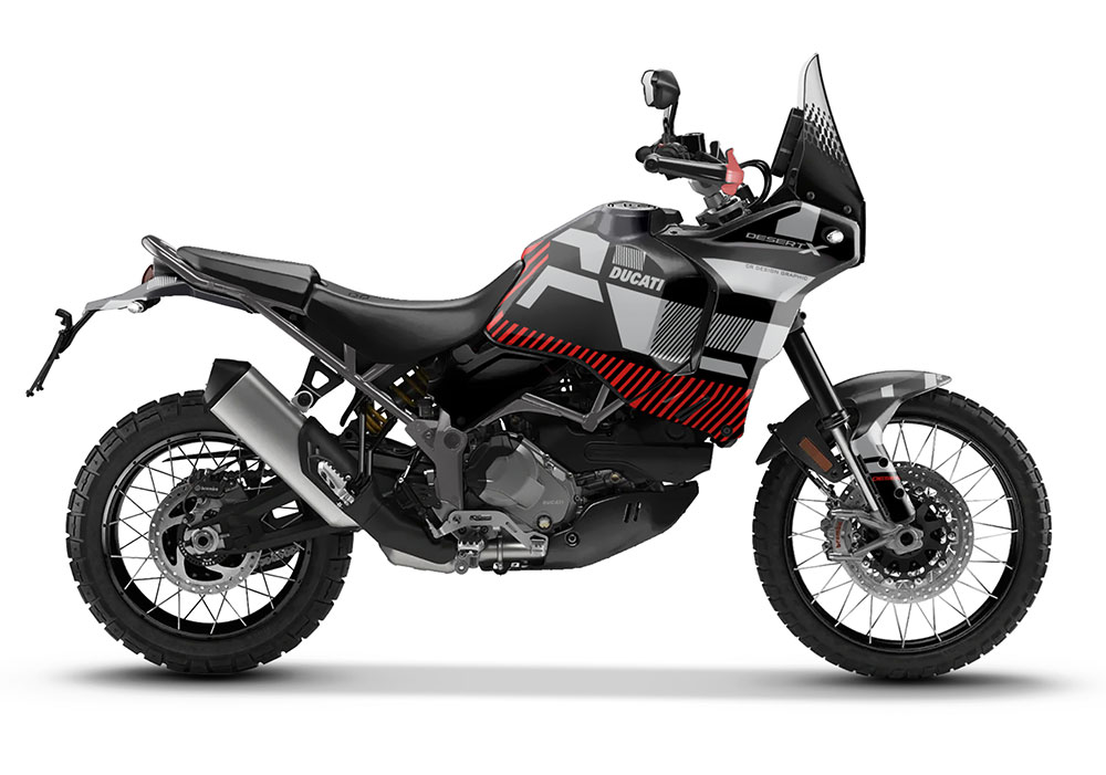 Kit grafiche adesivi per Ducati DesertX VXGRAY dal 2022 al 2026 con finitura lucida o opaca.
